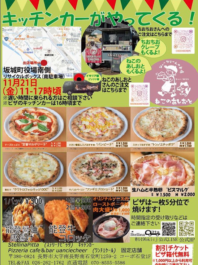 出店のお知らせ 2025年11月20日 最終更新日時 : 2025年11月20日 kimurakeita 【stellinapitta】ステリーナピッタ中山間地と地域を盛り上げるキッチンカー場所 坂城町役場の南駐車場側 リサイクルボックスがある場所日時 21日(金)11-17 ※ピザは16時頃 シュークリーム、クレープ、ピザ、揚げ物などお昼ご飯→3時のおやつ→晩御飯まで全て揃います😗 ぜひ!! Follow me! 関連 FacebooktwitterHatenaPocketCopy